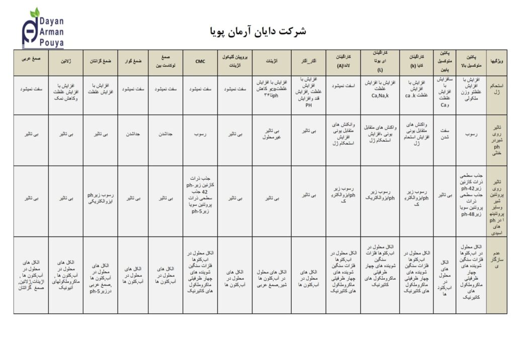 کدام صمغ یا هیدروکلوئید مناسب کدام ماده غذایی است وبا چه دوز مصرفی؟ جهت بررسی اینکه کدام هیدروکلوئیدها مناسب کدام موادغذایی هستند وبهترین دوز مصرفی چیست جدول زیر را مطالعه فرمایید؟